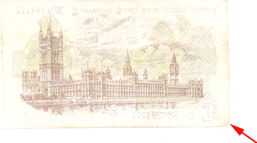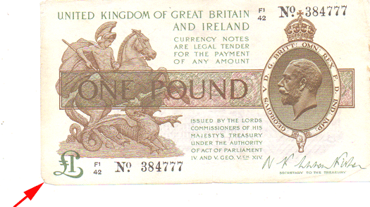 1923 Fisher - 1 Pound. Ref: T31 - 2nd issue - 1st type (No.) Black numbers. Dot below o of No● F1/42 N0. 384777 Mid series Grade: Obv. Clean. Trace of centre creases when held to the light. A frayed corner at bottom left edge Rev. Cleanish. Trace of centre crease and other minor creases Frayed corner at bottom right edge. Top right edge also slightly frayed Slightly dirty edge at 3 and 9 o'clock. Grade: If one disregards the frayed corner, etc. the grade is probably EF/EF?