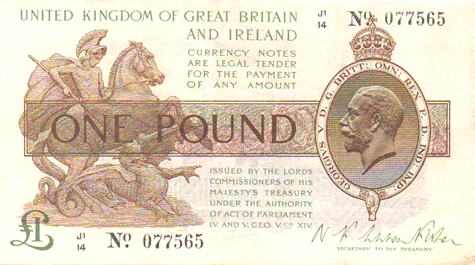 1923 Fisher - 1 Pound. Ref: T31 - 2nd issue - 1st type (No.) Black numbers. Dot below o of No● J1/14 N0. 077565 Mid series Grade: Obv. Clean. Small crease at the bottom right corner. EF+ Rev. Clean. Trace of a centre (vertical) crease EF+
