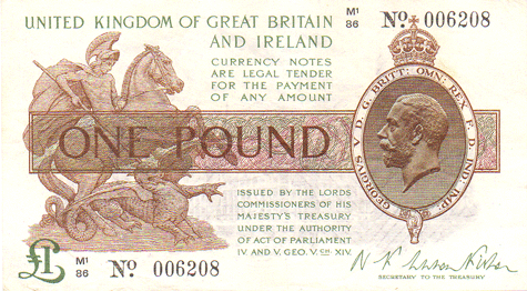 1923 Fisher - 1 Pound. Ref: T31 - 2nd issue - 1st type (No.) Black numbers. Dot below o of No● M1/86 N0. 006208 Mid series Grade: Obv. Clean. Trace of vertical creases when held to the light. EF+ Rev. Clean. Trace of vertical creases EF+