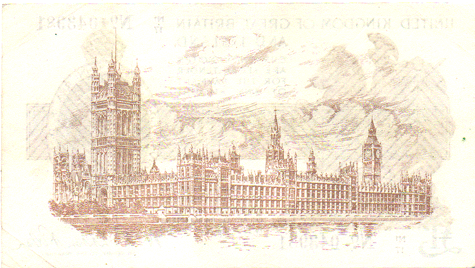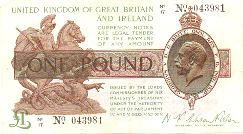 1923 Fisher - 1 Pound. Ref: T31 - 2nd issue - 1st type (No.) Black numbers. Dot below o of No● N1/17 N0. 043981 Mid series Grade: Obv. Cleanish. Traces of Vertical centre crease & over George's head. Corner crease top left and top & bottom right. EF Rev. Cleanish. Similar ceases to obverse EF