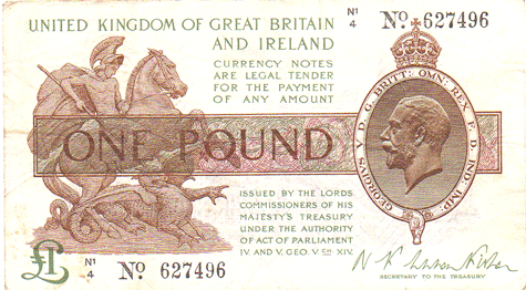 1923 Fisher - 1 Pound. Ref: T31 - 2nd issue - 1st type (No.) Black numbers. Dot below o of No● N1/4 N0. 627496 Mid series Grade: Obv. Cleanish but paper slightly toned. Trace of 3 vertical creases. VF Rev. Cleanish but paper slightly toned. Crease marks. F+-VF?