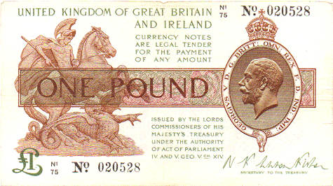 1923 Fisher - 1 Pound. Ref: T31 - 2nd issue - 1st type (No.) Black numbers. Dot below o of No● N1/75 N0. 020528 Mid series Grade: Obv. Cleanish but paper very slightly toned. Trace of vertical centre crease Very slightly rounded corners. EF Rev. Lightly toned paper. Trace of 'cross' crease. Having been folded in 4. EF?