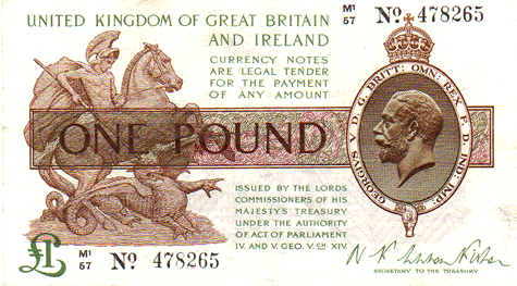 1923 Fisher - 1 Pound. Ref: T32 - 2nd issue - 2nd type (No.) Black numbers. Square Dot below No■ M1/57 N0■ 478265 Mid series Grade: Obv. Clean. Traces of creases EF Rev. Clean. Trace of creases. Possibly having been folded in 4 or 8 !? EF? * In over 20 years of dealing with banknotes I have only had TWO examples of T32 - 2nd issue - Type 2 - with SQUARE dot to No■ whereas T31 - 2nd issue - Type 1 with ROUND dot to No● over 50 examples. I therefore consider that examples of T32 are very much scarcer than T31.