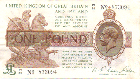 1923 Fisher - 1 Pound. Ref: T32 - 2nd issue - 2nd type (No.) Black numbers. Square Dot below No■ P1/82 N0■ 873094 Mid series Grade: Obv. Clean. Trace of crease from 9 to 3 o'clock (horizontal) EF Rev. Hardly a trace of creases !? Tiny edge crease bottom left corner. Possibly an ex-grease finger mark on the right edge at 4 o'clock. EF * In over 20 years of dealing with banknotes I have only had TWO examples of T32 - 2nd issue - Type 2 - with SQUARE dot to No■ whereas T31 - 2nd issue - Type 1 with ROUND dot to No● over 50 examples. I therefore consider that examples of T32 are very much scarcer than T31.