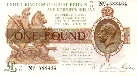 1927 Fisher - 1 Pound. Ref: T34 - 3rd issue - With "NORTHERN" IRELAND added - Black numbers. Dot below o of No● T1/75 N0. 588464 Mid series Grade: Obv. Clean. A tiny corner crease bottom left corner otherwise choice AUNC Rev. Clean Choice AUNC