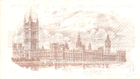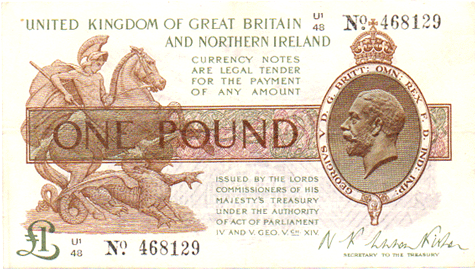 1927 Fisher - 1 Pound. Ref: T34 - 3rd issue - With "NORTHERN" IRELAND added - Black numbers. Dot below o of No● U1/48 N0. 468129 Mid series Grade: Obv. Clean. Trace of creases when held to the light. EF+ Rev. Clean Trace of creases when held to the light. EF+