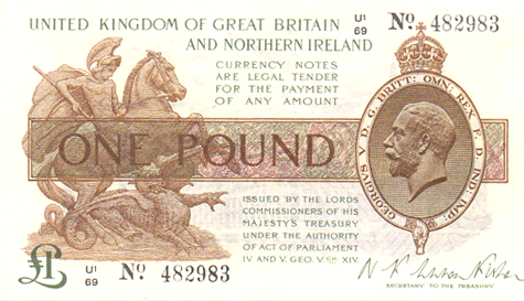 1927 Fisher - 1 Pound. Ref: T34 - 3rd issue - With "NORTHERN" IRELAND added - Black numbers. Dot below o of No● U1/75 N0. 482983 Mid series Grade: Obv. Clean. Hint of a centre crease otherwise choice. AUNC Rev. Clean Hint of a centre crease otherwise choice. AUNC