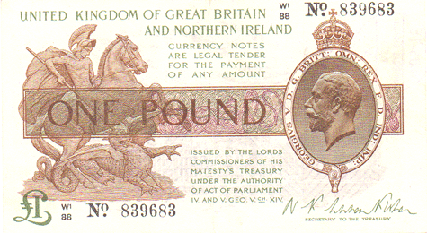 1927 Fisher - 1 Pound. Ref: T34 - 3rd issue - With "NORTHERN" IRELAND added - Black numbers. Dot below o of No● W1/88 N0. 839683 Mid series Grade: Obv. Clean. Trace of vertical centre crease. EF+ Rev. Clean Trace of vertical centre crease. EF+ Circular red bank stamp at top left corner 40-05-15 OVERSEAS BRANCH E.C.3 1 * * 40-05-15 was in 1927 the Midland Bank's Overseas Branch at 60 Fenchurch Street, London, E.C.3 In 1992 that branch became the HSBC international Branch when they merged.