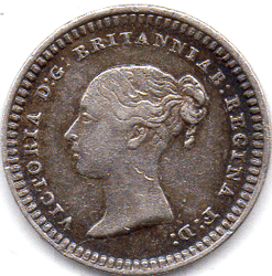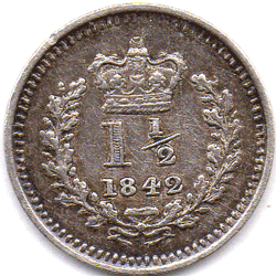 TH 1842 C - Three halfpence - Obv. 2 tiny nick on back of Victoria's neck. Rev. Tiny edge nick at 11 o'clock. Both the 1 & 2 of the fraction have been double struck. This is not the same as Type B with small 2 over larger 2 These are just repairs as the raised 1 of the fraction has been repaired with the 1 punched in higher over lower 1. The raised 2 has been punched in lower over higher 2. Very small gap between tops of 2's. The front tip of the foot of the lower 2 sticks out slightly from the repaired 2.