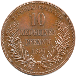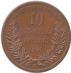 1894 German New Guinea 10 Pfennig. The coin is choice EF+ with traces of lustre in the legend and the inner part of the leaves Our Price.....................£400.00