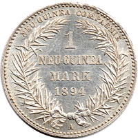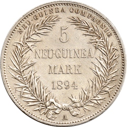 An 1894 German New Guinea 1 Mark. The coin is in Bright EF to EF+ except that at the top edge - Obv. 11 o'clock to 12 o'clock the edge has been pinched. Rev. 12 o'clock to 1 o'clock the same but to a slightly lesser extent. Difficult to know if it is a flaw to the blank or the coin has been pinched in that area. Otherwise still a very nice coin. Our Price........................SOLD