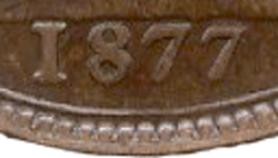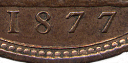 BP 1877 A - Reverse j - Small date BP 1877 B - Reverse k - Large date numerals very close together numerals well spaced apart 9 beads from 1 to last 7 12 beads from 1 to last 7 Extremely rare reverse for this date