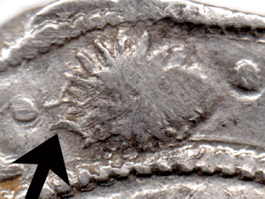 Obv. Mintmark: Sun over Eye (Eye mintmark was used in 1645 & Sun from 1645 thru 1646) An arrow shows the part of the eye mintmark that shows to the left side of the sun.