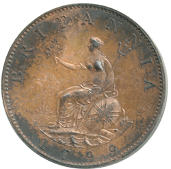 Restrike pattern – Type R78. Peck 1258 – Bronzed [R] Obv. 1. Draped bust wearing a large crown. 2. K . on the lowest fold of the shoulder drapery. 3. Only half a pearl above cross on front of crown. Rev. 1. Britannia seated on rock, with shield, trident & olive branch. 2. Middle prong of trident points to 1st limb of N 3. . . on raised to right of rock, SOHO below shield. 4. Thin raised line around shield, except to left & right of SOHO. 5. 4 short horizontal lines between trident and shield. 6. New ship with poop deck but NO gunports. 7. Under the stern is an irregular raised lump. 8. A flaw runs from curved edge of sea, across Britannia’s foot, down to rocks. 9. A flaw runs either side of the second 9 of 1799.