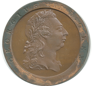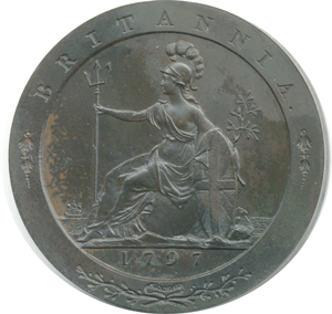 Restrike pattern – Type KP54. Peck 1142 – Bronzed [VR] Obv. 1. Large undraped bust: small letters. 2. K: on the lowest fold of the shoulder drapery. 3. Front of bust is thinned but rounded. Rev. 1. Britannia helmeted, seated on globe: small letters. 2. Bare left breast, with nipple. 3. K (no dot) under shield; SOHO in floral tie, below date. * Dark toned reverse - top right section very slightly rusty or faint claggy.