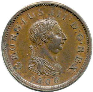 1806 Copper penny - incuse curl, right of tie-knot Obv. A small section of extra metal at the rim - goes virtually the whole way round from 1 to 11 o'clock. Also large extra raised dot of metal above 8 of date and just touching the base of the bust. A smaller raised dot of metal just behind the back of the neck - at height of E of GEORGIUS Rev. A dark tone patch above ship otherwise hint of lustre in the legend