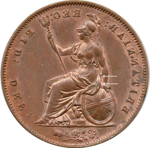 Note: On the die that would have been used to produce the reverse of the penny - Britannia would be in incuse or sunken on the die and the tiny area from her elbow to wrist would be flat or appear raised on the die.