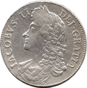 1687 Crown - James II - Edge: TERTIO Obv. Very slight haymarking on top part of hair and on wreath. Rev. Small ex-carbon spot to the left of G of MAG. The French shield at 6 o'clock has light haymarking. At 9 - 10 o'clock there is a slight flaw in the metal at the edge of the coin (slight bit of metal missing) !? Grade: Bright EF or better ? Otherwise a really nice coin with virtually no wear.