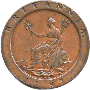 1797 Twopence - Obv. Virtually no noticeable edge bruising. Rev. Virtually no noticeable edge bruising. Very fine hairline scratch from top of olive branch to below T of BRITANNIA.. Still a nice example and scarce in higher grades. Grade: EF (Unusual that there is no real visible edge bruising) !