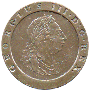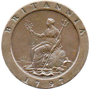 1797 Twopence - Obv. One very slight edge bruise at 1 o'clock (not visible in picture) Otherwise just a couple of tiny edge nicks. Several pin-head size indents between George's chin & EX of REX Also a few small pin-head size indents on George's cheek and very old hairline scratch across George's ear. Rev. NO clearly visible signs of edge bruises. A couple of tiny scratches between Brit's right knee and right arm. Still a nice example and scarce in higher grades. Grade: EF?/EF (Due to the pin-head indents on the obv. the rev is graded as better.