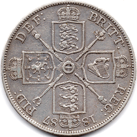 1887 Double Florin - 1 + B (Mule)* Date: Arabic 1 VF - Bright * It is amazing that this obverse / reverse combination has never been spotted or recorded in any reference or variety book. It is neither in 'British Silver Coins since 1816' by Peter J. Davies or the 'new' E.S.C. [English Silver Coinage since 1649] By M. Bull. It has always been assumed and noted that obverse 1 was paired with reverse A (Roman I) & obverse 2 with reverse B (Arabic 1). I discovered this variety back in 2003 and decided to hold back on revealing this variety until now (December 2016) in an attempt to see how many I could find before this variety was discovered and made public. I can assure you that this (Mule) obverse / reverse combination is much harder to find than other Double Florin varieties. It is possible that the amount made of these "mule" Double Florins is only about 5% of the total of the 1887 Double Florin production. As I am starting to list ALL of the unknown varieties that I have discovered over the years from Crowns to farthings I am now pleased to include this 'new' (still) unlisted variety. |