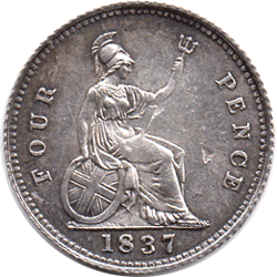 GR 1837 A - 1 + A - Rev. Tiny metal flaw between Britannia's right knee and the C of PENCE.