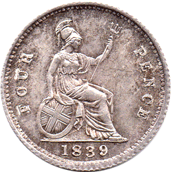 GR 1839 Bc - Obv. Small extra colon dot above and attached to the top colon dot after F: and extra colon dots below colon dots after D: and to the left. Rev. Type B (Broken C in PENCE - See either 1838 or 1839 for further details). Date: Type c The 9 is slightly smaller and narrower that the 9 used with type A & B. The top inner circle is slightly more tall oblong ! The 3 as in type B is thinner than that in type A and also appears to be just below the base line. Grade: Choice Light tone around legend pAS