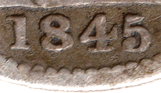 1845 Date varieties All of the 1845 groats appear to have the 18 of the date in a fixed position. The position of the 45 can vary slightly as can the size of the font. * Previously from 1840 to 1844 all of the 4's (bar 1 ?) had a T-bar tail.
