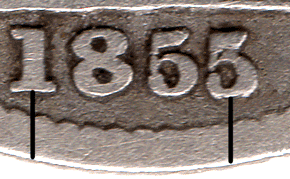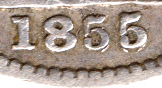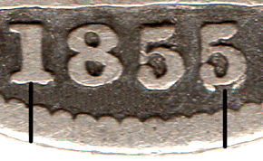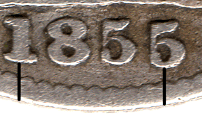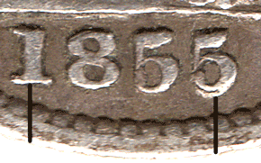 Groat 1855 A - Date: Type c The 1st 5 is over a slightly lower 5 (Just the base showing) The 5's are of equal size and font and slightly wider apart that 1855 A It is possible that there might be the faint double striking of the 2nd 5 Date width is 10 teeth (9 teeth and 2 x ½ ) Groat 1855 A - Date: Type d The 2nd 5 is over a slightly lower 5 (Just the base showing) The 5's are of equal size and font size might be slightly larger as the 55s are both below the base line. Date width is 9 ½ (9 teeth and 1 x ½ ) [Normal spaced width]