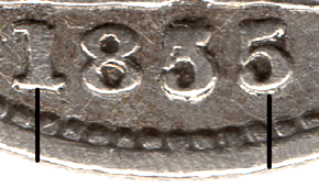 Groat 1855 A - Date: Type e The 2nd 5 is over a slightly lower 5 with only part of the under 5 showing - with a gap in the centre Both 5s are on the base line. Date width is 9 ½ (9 teeth and 1 x ½ ) [Normal spaced width] Groat 1855 A - Date: Type g Both 5's are now double struck. Both with just a small part showing below each of the 5's. Both 5s are on the base line. Date width is 9 ½ (9 teeth and 1 x ½ ) [Normal spaced width]. Date: 1855 with 5 over 3 ! Reason for this variety not to exist !
