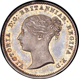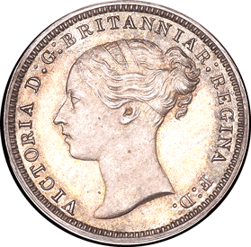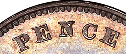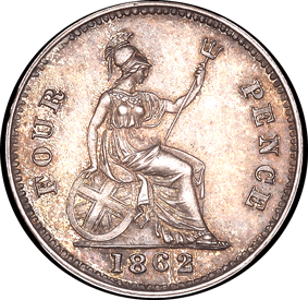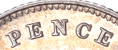 Groat 1862 R - Obv. 2 As per Obv. 1 but now the top of Victoria's e ear is now partly covered. As per the above image with the comparison with Obv. 1 The legend and everything else remains the same as per Obv. 1 except that there only a stop after F. and a single top colon dot after D. of F. D. Rev. E Further changed has been made to the legend FOUR & PENCE FOUR The F of FOUR appears either to be an F over an F. One of the F's tilts backwards slightly. See GR 1862 R below for a better image. The upright leg appears to be slightly fatter than the norm. The U of the FOUR is unique in that it appears to be in reverse ! See the images and compare with the norm. See GR 1862 R. The solid left leg is now a solid right leg ! The thin right leg is now a thin left leg. Was a broken punch used ? As the ¾ height of the right edge of the solid left leg remains - but not the infill ! The R has a faint trace of having been double struck - as bits show below and slightly to the right. PENCE The P of PENCE is more solid in both leg and the front edge of the P. The P appears to be slightly out of alignment with the E - slightly lower. The E of PENCE is also more solid in the upright leg. On the 1st E - between the centre bar of the E the normally straight upright appears to be slightly convex (rounded slightly outward) ! ? Could this be due to the E being struck over another E !? The 2nd E does not appear to have this slight convex 'bit' and I am sure that both E's would have been struck from the same punch ! The length of the upright centre bar is much longer than normal. The centre bar of the N of PENCE is slightly thicker than normal. My example for comparison unfortunately has a double struck centre bar which now makes it the same size as the 'new' N. The C of PENCE has a slightly thicker back and the top serif is also different to the norm. See the images. Date: The '62' are struck above the baseline. The 8 has been double struck. Obverse 3 - with Plain edge ↑↑ (Medal alignment)