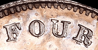 Groat 1862 S - Obv. 3 - There are now many more border teeth than used for Obv. 2. The font letter are similar to those of Obv. 2 except that they are now slightly bolder. The A of VICTORIA is now closer to the D of D: G: and the B of BRITANNIAR is closer to the G: of D: G: The R of REGINA is also closer to the colon dots ater BRITANNIAR. The Colon dots after D: of F: D: no longer align with the back of Victoria's truncated neck, they are now slightly further under. The colon dots are now very strong and pronounced. Victoria's eye is fractionally larger and more pronounced. Victoria's nose is very slightly aquiline (very slight upward bulge !). Victoria's lip are bolder and her mouth is slightly more open. Victoria's neck now has a very slight bulge, just at the start of her neck. The front of her truncation is now rounded instead of being pointed. Victoria's face is very slightly fuller. Her hair is even more sharply defined and the top of her ear is still covered. Rev. E Exactly the same as all of images for GR 1862 P & GR 1862 R FOUR The F of FOUR appears either to be an F over an F. One of the F's tilts backwards slightly. See GR 1862 R below for a better image. The upright leg appears to be slightly fatter than the norm. The U of the FOUR is unique in that it appears to be in reverse ! See the images and compare with the norm. See GR 1862 R. The solid left leg is now a solid right leg ! The thin right leg is now a thin left leg. Was a broken punch used ? As the ¾ height of the right edge of the solid left leg remains - but not the infill ! The R has a faint trace of having been double struck - as bits show below and slightly to the right. PENCE The P of PENCE is more solid in both leg and the front edge of the P. The P appears to be slightly out of alignment with the E - slightly lower. The E of PENCE is also more solid in the upright leg. Between the centre bar of the E the normally straight upright is slightly convex (rounded slightly outward) ! The length of the upright centre bar is much longer than normal. The centre bar of the N of PENCE is slightly thicker than normal. My example for comparison unfortunately has a double struck centre bar which now makes it the same size as the 'new' N. The C of PENCE has a slightly thicker back and the top serif is also different to the norm. See the images. Date: The '62' are struck above the baseline. The 8 has been double struck. My thanks to J. F for his help in identifying the 1862 with obverse 3.