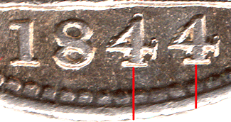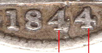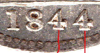 Groat 1844 - Date: Type a - The top of the 4 is pointed. The 4 has a T bar tail. The 4 appears to be a slightly larger font than the 18. The tops are higher than the 18. The distance between the two 4's is from a gap (between border teeth) and 3 & half teeth. Groat 1844 - Date: Type b - The top of the 1st 4 is flat. The 4 has a T bar tail. The 4 appears to be a slightly larger font than the 18. The 2nd 4 is entered higher than the 1st 4. Die flaw from edge through back of 1st flaw. Groat 1844 - Date: Type c -The top of the 4 is pointed. The 4 has a T bar tail. The 4 is a smaller font. The T bar tail is also much smaller The distance between the two 4's is from a gap (between border teeth) and 3 teeth - to gap. * Not sure if one date type is scarcer than the other !?