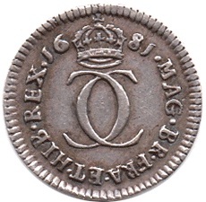 1681 Maundy 2d. Obv. A repair to the last A of GRATIA was mis-struck and shows between