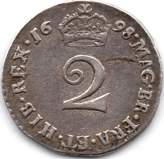 1698 Maundy 2d. Obv. Colon stops after III DEI & GRA very weak - only just visible !