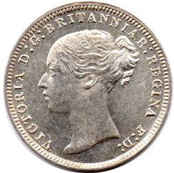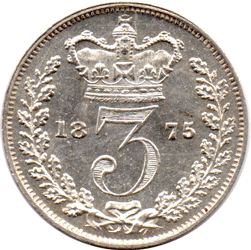 ST 1875 B - Obv. 3 Similar to ST 1875 A except that Victoria's nose has the missing nostril. Victoria's top lip is rounded as per all obverse 3 types. Grade: Bright - EF+-pAS * Examples with the 'part' missing nostril were first noted ONLY for 1873. It now appears that that obverse die was used later up to 1878. As there are far fewer examples found with the use of this die they can be considered scarce. It is difficult to estimate the scarcity with this die as probably no one has looked before to see if this 1873 obverse B die type continued after 1873 !