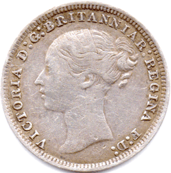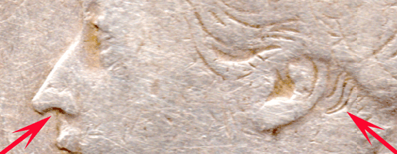 ST 1879 D - Obv. 3C - Victoria's hair heavily re-engraved - missing nostril. The missing nostril and incuse nape hairs are shown by RED arrows. To see all areas that Victoria's hair was re-engraved Grade: Obv. Normal tone. Rev. Slightly darker tone. VF/VF+