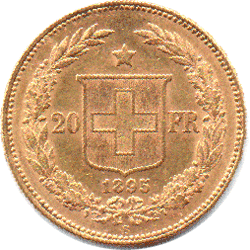 1895 Switzerland 20 Francs (Crowned head) [0.1867 AGW] Issued from 1883 to 1896