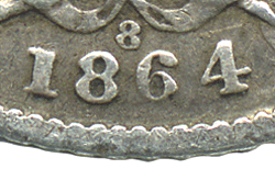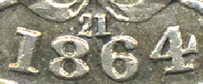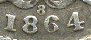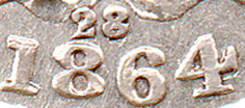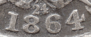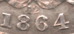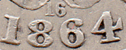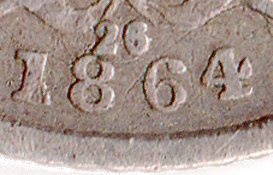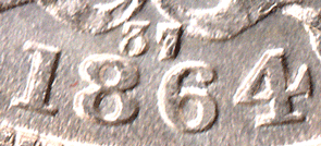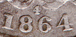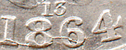 The 1864 sixpences with the plain tail end 4, [small numerals]. (type A) have been seen up to die no. 12 type A is the scarcer type of the two issues. The 1864 sixpences with the 'slant-up' tail end 4, [larger numerals], (type B) have been seen from Die no. 13 to 41 [near all numerals in-between have been found]. Die no. 58 has been noted in the new "English Silver Coinage" - but not confirmed ! No other dies numbers from 42 to 57 have been ever seen or found ! In the Baldwin's of St. James's auction 27 March 2017, Lot. 201 an example of an 1864 sixpence with die no. 57 was listed. However, this was incorrect and the die number was mis-identified. It was found to be die no. 37 (as I purchased this coin) - The picture is shown below. I would now suspect that the 1864 coin listed with die no. 58 was probably with die no. 38. * A couple of the 'slant-up' tail end 4 have been noted with small numerals. i.e. die No. 26. Davies lists die no. 41 as also being with small numerals. As I don't have an example of die no. 41 to hand I cannot confirm this sighting but if recorded by Davies it is more than likely correct. There could well be other die numbers with small numerals as yet un-recorded. Die no. 26 has small well spaced numerals - note the different style of numerals used for the larger issue. I suspect that examples with small numerals for this date are rare. There are examples with wide dates (26), normal spacing dates & narrow dates (28). The tail end of the 4 to Die no. 26 & 37 is more "triangular - wedge shaped" to 'slant up' I show the below die numbers - just for the record