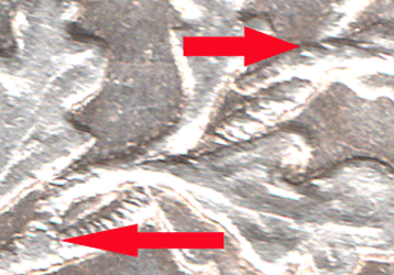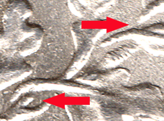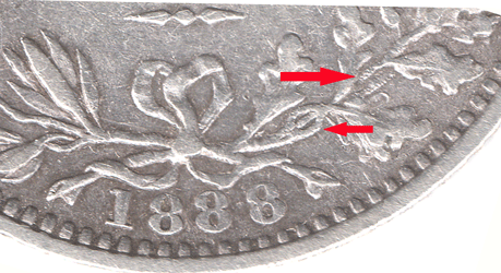 SX 1888 A - with reverse B - The branch on the right side of the wreath, where the 2nd leaf leans to right there is a small 'bit in the centre that attaches to nothing. The branch at the bottom curls upwards as if connected to the leaf that points upwards. The continuing branch points forwards to the next leaf that leans right - the branch above does not appear to be in line or connected to the branch below ! * This reverse seems to be fairly scare. SX 1888 B - with reverse C - The branch on the right side of the wreath, where the 2nd leaf leans to right the leaf now has a strong connection to the branch. There is a hairline centre stalk that appears to connect to the upwardly pointing leaf. The branch at the bottom is now very much stronger and appears to be continue under the back of the leaf, leaning to the right and connect to the branch above. That was not to clear in reverse B. The continuing branch curves slightly upwards to just behind the next leaf that leans to the right and appears to connect to the branch above. * This reverse seems to be the commonest/normal for the issue. SX 1888 C - with reverse D - The branch on the right side of the wreath, where the 2nd leaf leans to right the leaf now very clearly splits in 3. It appears as an oval with a line running through the centre. The top stalk is for the leaf that leans to the right. Both the centre and the bottom branch/stalk seem to go towards the leaf pointing upwards. There then appears to be two branches. The lower one going - nowhere ! and the one above is the branch continuation. * I have now managed to purchase a 2nd example of this unusual reverse type. (Feb. 2018)