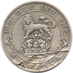 1922 X Sixpence - Obv. Tiny die crack / flaw at top of head. Rev. A large slice of the bottom part of the coin is missing - due to the poor metal mix. See picture above. Interesting that the XPENCE of the missing section is still clearly visible. An interesting example of the problems in striking these coins with only 0.500 silver.