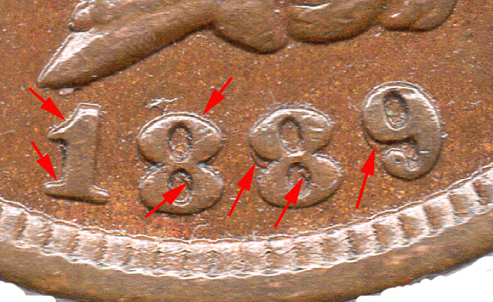 1889 USA - 1 Cent Obv. Very slight rub on the Indian's cheek. Date: All of the numerals are double struck. Different !