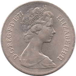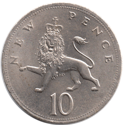 1971 10 'new' Pence - Struck on a very thin flan. 8.1 grams instead of the normal 11.5 grams and approximately 1.2 mm thick instead of 2.0 mm. This sort of coin happens when the sheet from which the coin 'blanks' are cut out of tapers at the edge of the sheet. Normal the Royal Mint stops short of the end of the sheet so as to make sure that all of the blanks are of the right weight and thickness. Very occasionally as in the case of this coin the coin was struck from a thinned end of a sheet. When a thinner tapered blank is inserted into the printing or die stamping machine the result is the stamping is not as strong especially with the raised rim and border beads. The Queen's head and the Lion are still fairly well struck as they are prouder than the rim and beads. The edge milling is also not that well cut and in some places - non-existent ! Coins like this are rare as due to quality control and they seldom escape from the Mint. This coin must have been taken quickly out of circulation as the grade is EF+. Sold left as reference