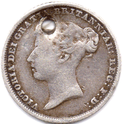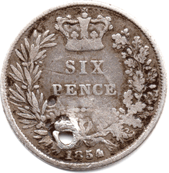 SX 1854 A - Obv. Small hole at 11 o'clock, just below the 'IA' of GRATIA on Victoria's forehead. Rev. Small hole between 6 - o'clock, just above 1 of date at base of left side wreath. A small indent just above the hole and below 'P' of PENCE. Date: Is clear of the hole. The 4 has a T-bar tail Grade: Fine. An extremely RARE date