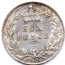1908 Sixpence - Grade: EF+ Faint hint of toning starting in legend and wreath