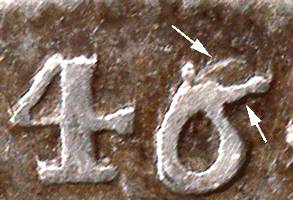 1746 Maundy 3d - The above pictures are to show my conclusions on what has occurred with this date. One reference book concludes that the 6 could be over a 5. I discount this theory as there was no 1745 Maundy 3d coins made so where would the 5 come from ? My scans show how the 3 could be the under date. 1743 was the last date prior to 1746 that any Maundy coins were made. So using up 1743 dies would be logical. The top 'tail' of the 6 was broken or weakly struck. Either it is the back of the 3 that is the new 'tail of the 6 or a punch was used to add a 'bit' from the circular part of the "O" to the back of the 3 !! One would think that there should be a 1746 3d with the 'upright' tail to the 6 but so far it appears that ALL 1746 3ds are as per the above !?