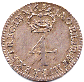1689 Maundy 4d - Obv. 'G' below bust & stop after D. of D. G but no stop after G Rev. A in MAG - triple struck lower. E of ET double struck & N of REGINA double struck. All very poor repairs with inaccurate strikes. Especially the triple strike of the A in MAG. Date: .1689 (Stop before date but not after). Was the 9 double struck ? Grade: EF+ Obv. Very light reddish tone in legend. Rev more toned * For images of varieties see our other example