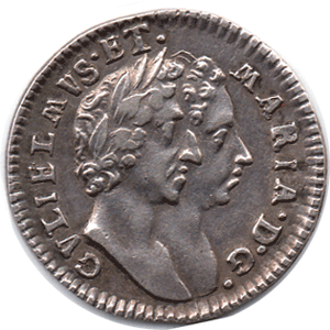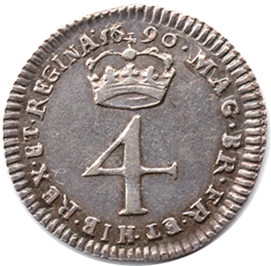 1690 Maundy 4d - Obv. 'G' below bust & stop after D. G. A very unusual combinations of font sizes have been used. GVLIEL are medium size. M is small (as used for MARIA). ET is large ! MA are small. R is medium. IA is again small. D. G. are medium. Rev. Again a combination of font sizes are used. MAG. BR. FR. are medium. ET. HIB. REX. ET. REGINA are small. Date: .1690. Very high stop before date (after REGINA) & the 6 appears to be over a 5. This I consider is probably impossible and the more likely explanation is that it was a trial punch of a 6 administered with on the left side in contact with a SMALL 6 die ! However it appears easier to list this as 6 over 5 !