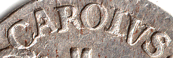 1679 Maundy 3d. Obv. The "L" of CAROLVS looks like an "I" as the foot is virtually no existent or weakly struck. The V is also of a slightly larger font and does not really give room for the full foot of the L. * Note with this variety the "C" of CAROIVS is touching the back of Charles's bust.