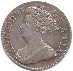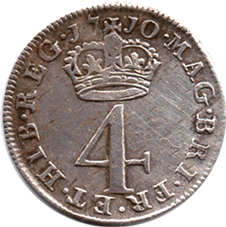 M4 1710 - Obv. 3nd bust type. New slightly larger bust. Single curl at top. see this page for details. Rev. 2 (new style Crown & 4 on the reverse) see this page for details. The coin is toning slightly. There are also small dark flecks in the metal that don't really show up on the scan. EF